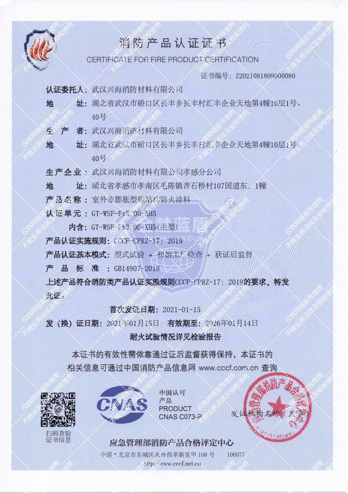 室外非膨脹型鋼結構防火涂料消防產(chǎn)品認證證書